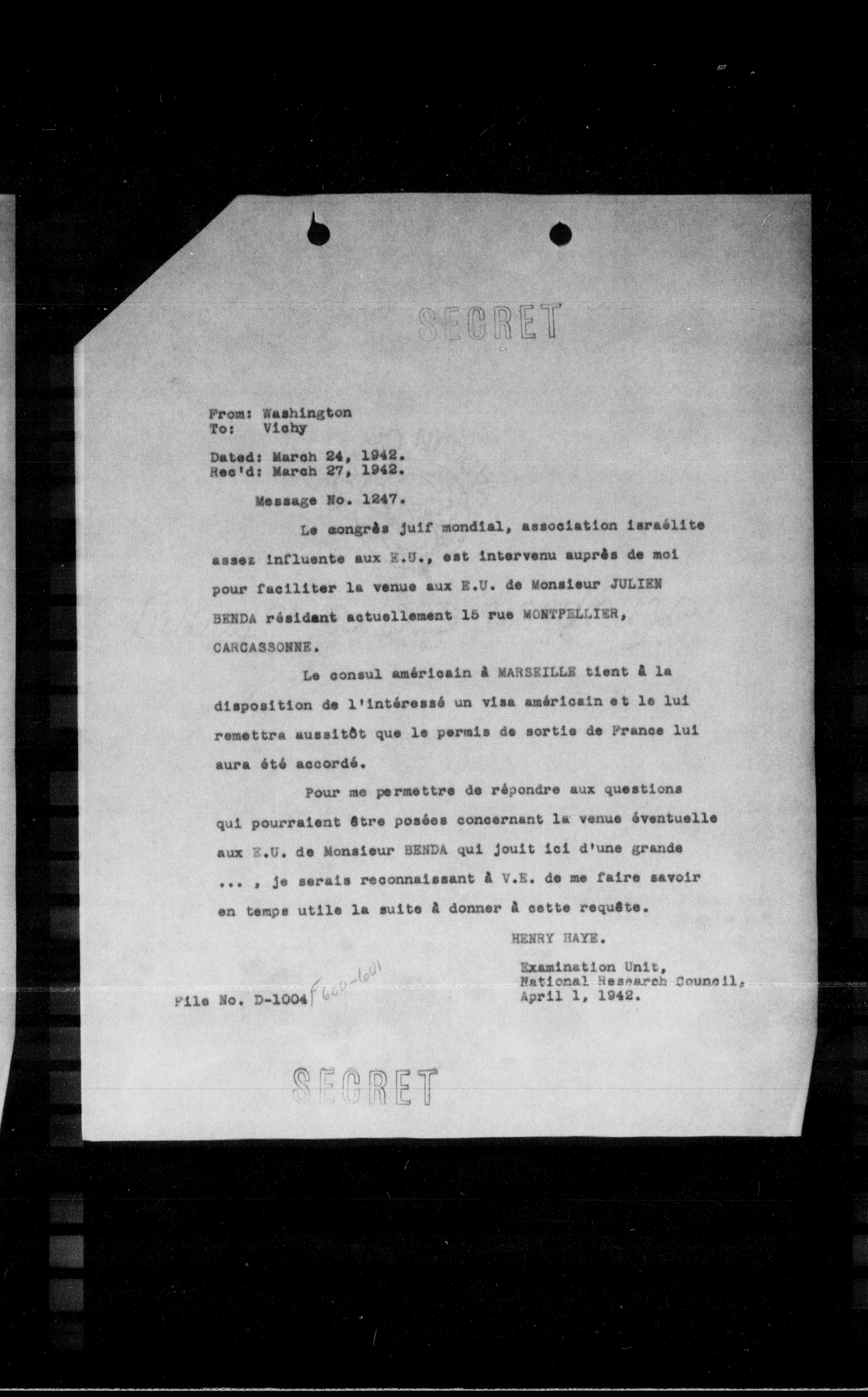 Le congrés juif mondial, association israélite assez influente aux E.U., est intervenu auprès de moi pour faciliter la venue aux E.U. de Monsieur JULIEN BENDA résidant actuellement 15 rue MONTFELLINR, CARCASSONNE.