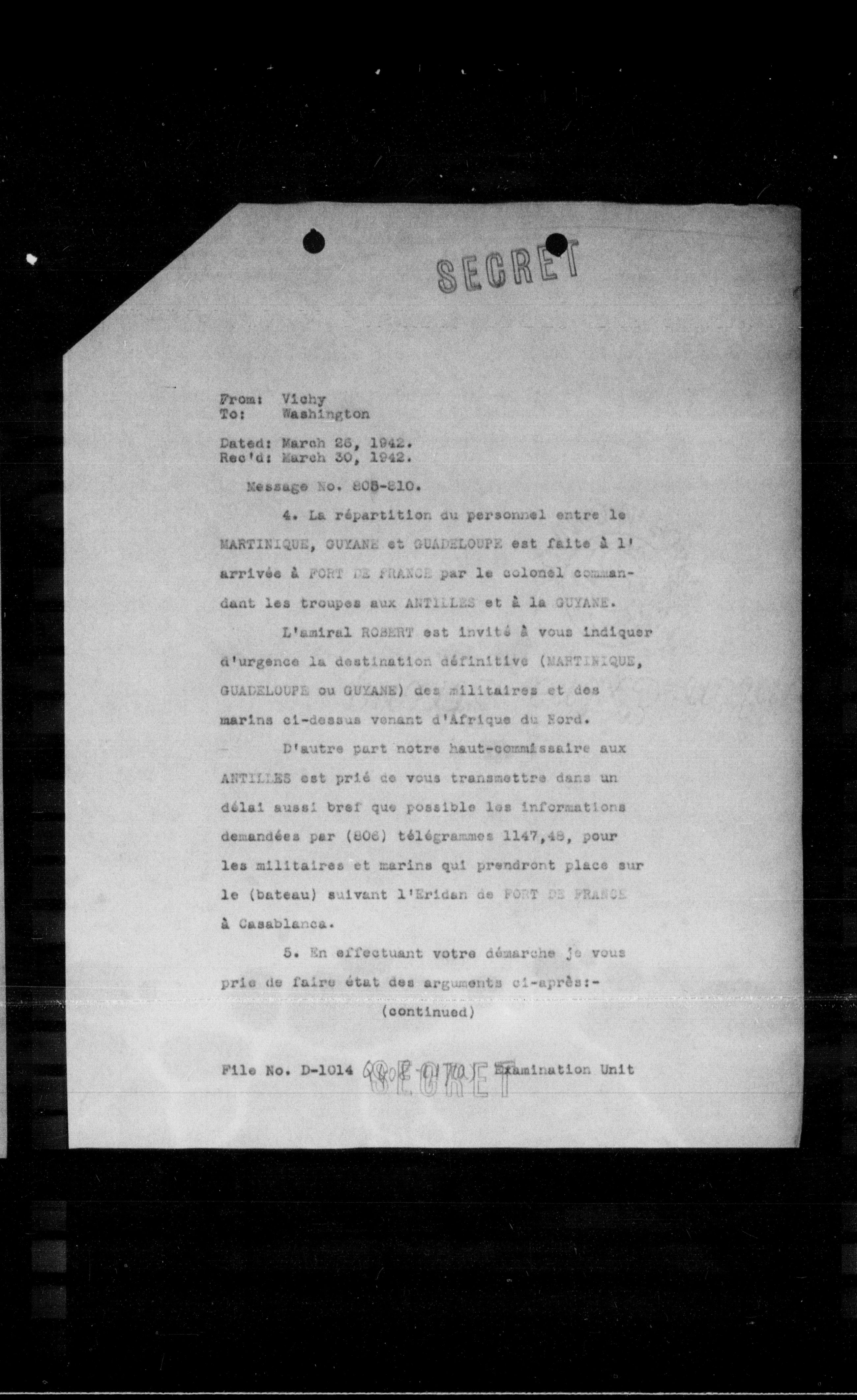 L'amiral ROBERT est invité a vous indiquer d'urgence la destination définitive (MARTINIQUE, GUADELOUPE ou GUYANE) des militaires et des marins ci-dessus venant d'Afrique du Nord.