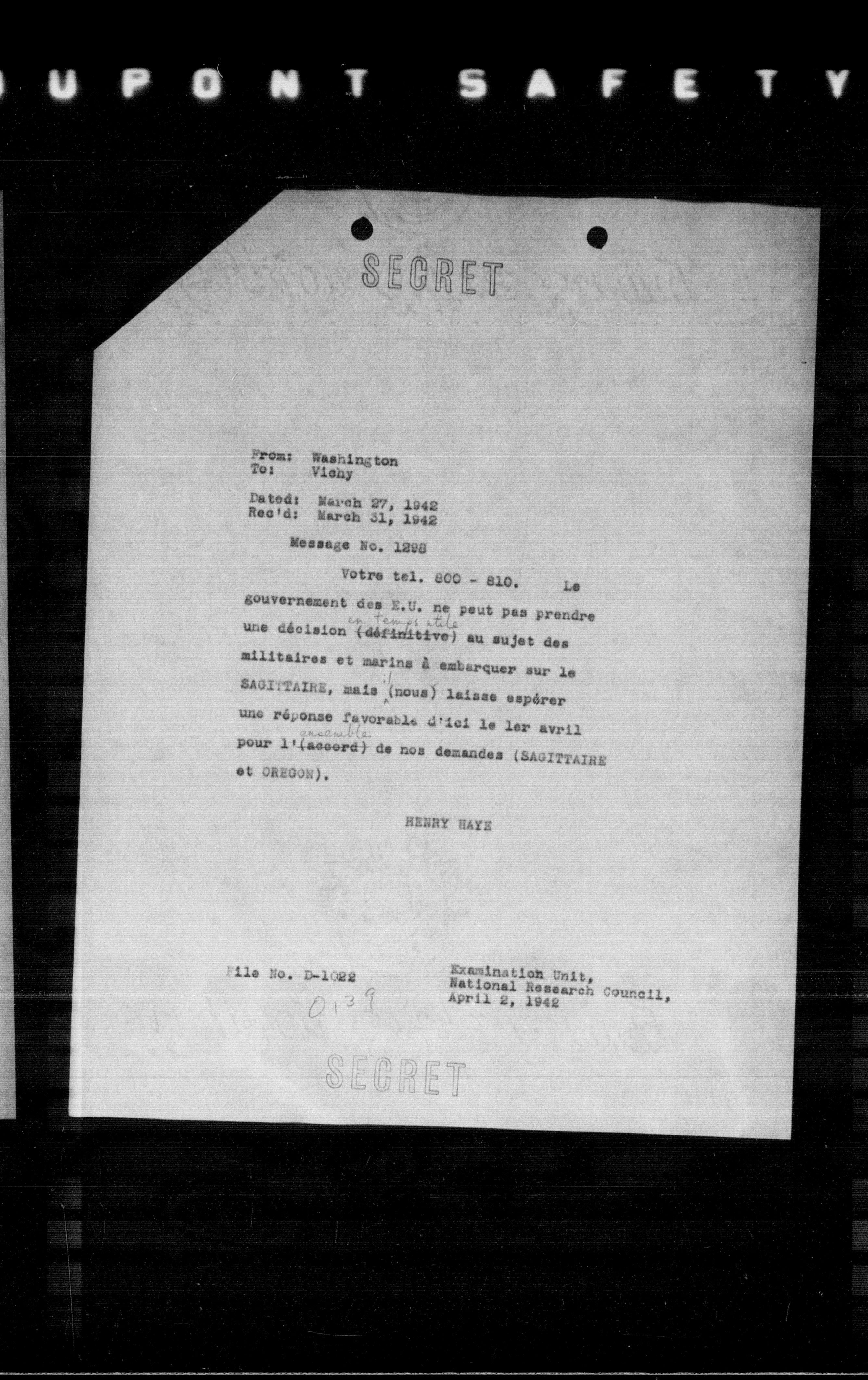 Votre tel. $800-810$. Le gouvernement des E.U. ne peut pas prendre une dćcision (défintive) au sujet des militaires et marins à embarquer sur le SAGITTAIRE, mais (nous) laisse espérer une réponse favorable d'ici le ler avril pour l'(assord) de nos demandes (SAGITTAIRE et GREGOR).