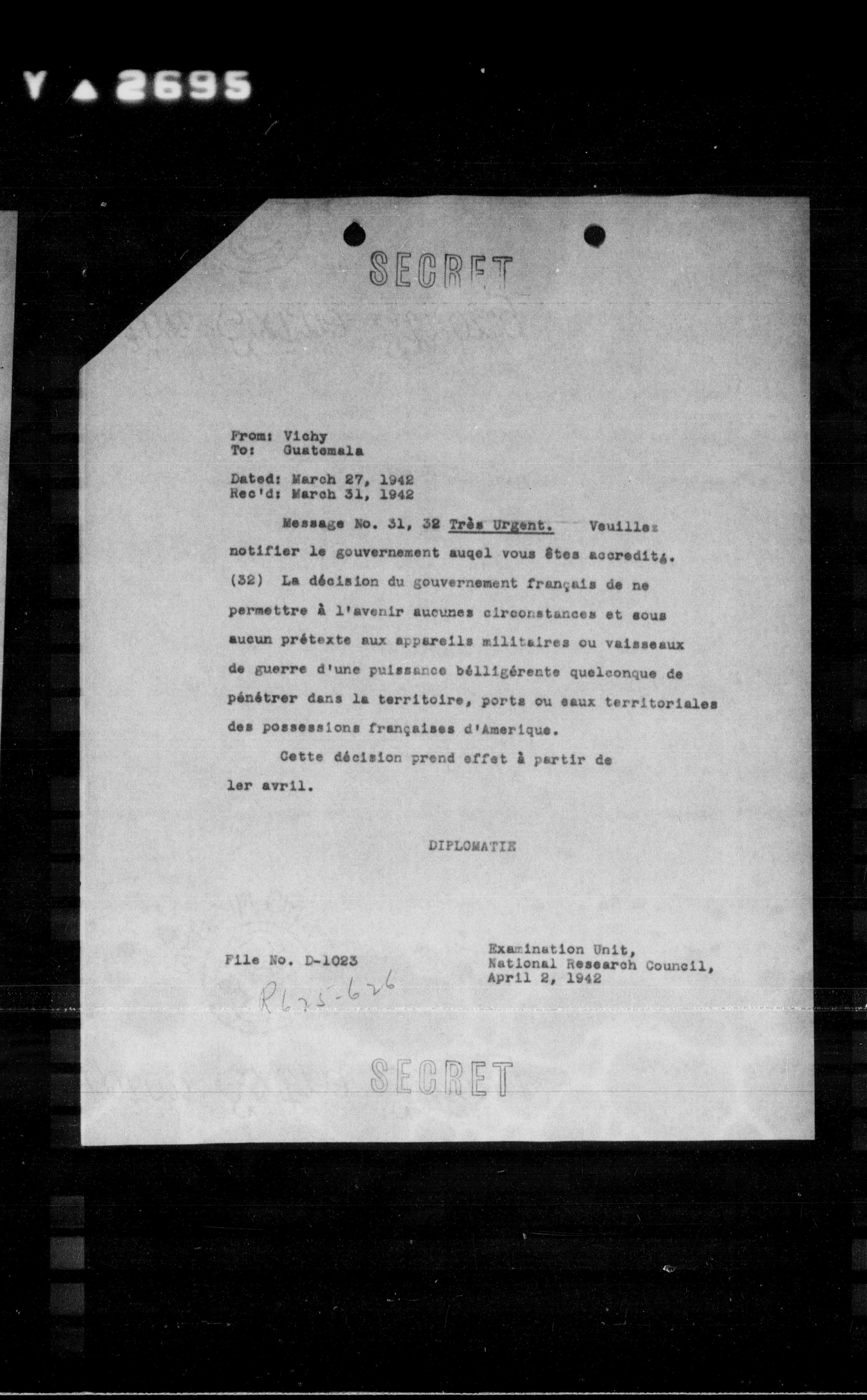 Message No. 31, 32 Très Urgent. Veuillez notifier le gouvernement auqel vous êtes acoredits. (32) La dćcision du gouvernement français de ne permettre à l'avenir aucunes circonstances et sous aucun prétexte aux appareils militaires ou vaisseaux de guerre d'une puissance bélligérente quelconque de pénétrer dans la territoire, ports ou eaux territoriales des possessions frangaises d'Amerique.