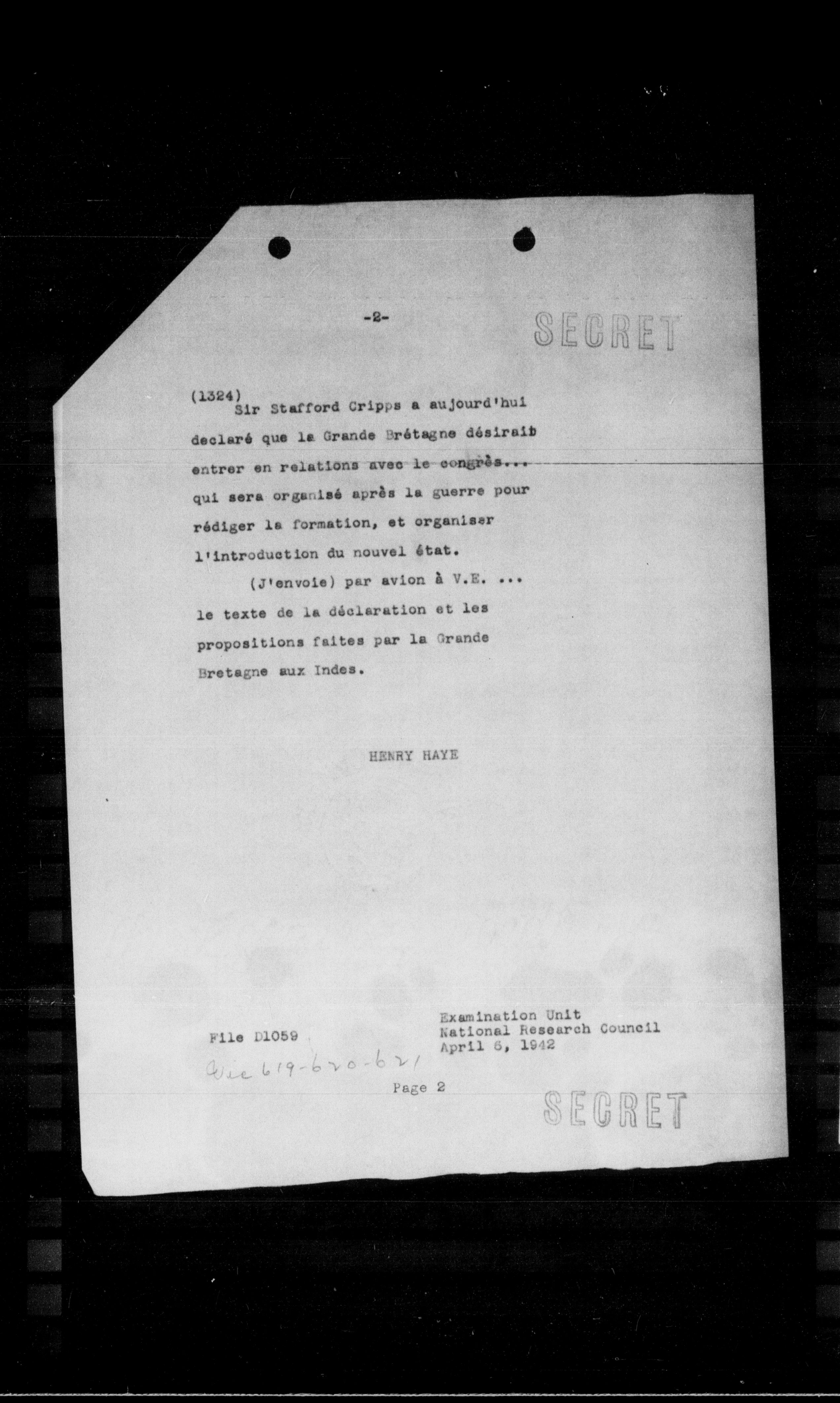 Sir Stafford Cripps a aujourd'hui declaré que la Grande B́táagne déslralb entrer en relations avec le congres... qui sera organisé après la guerre pour rédiger la formation, et organiser l'introduction du nouvel état.