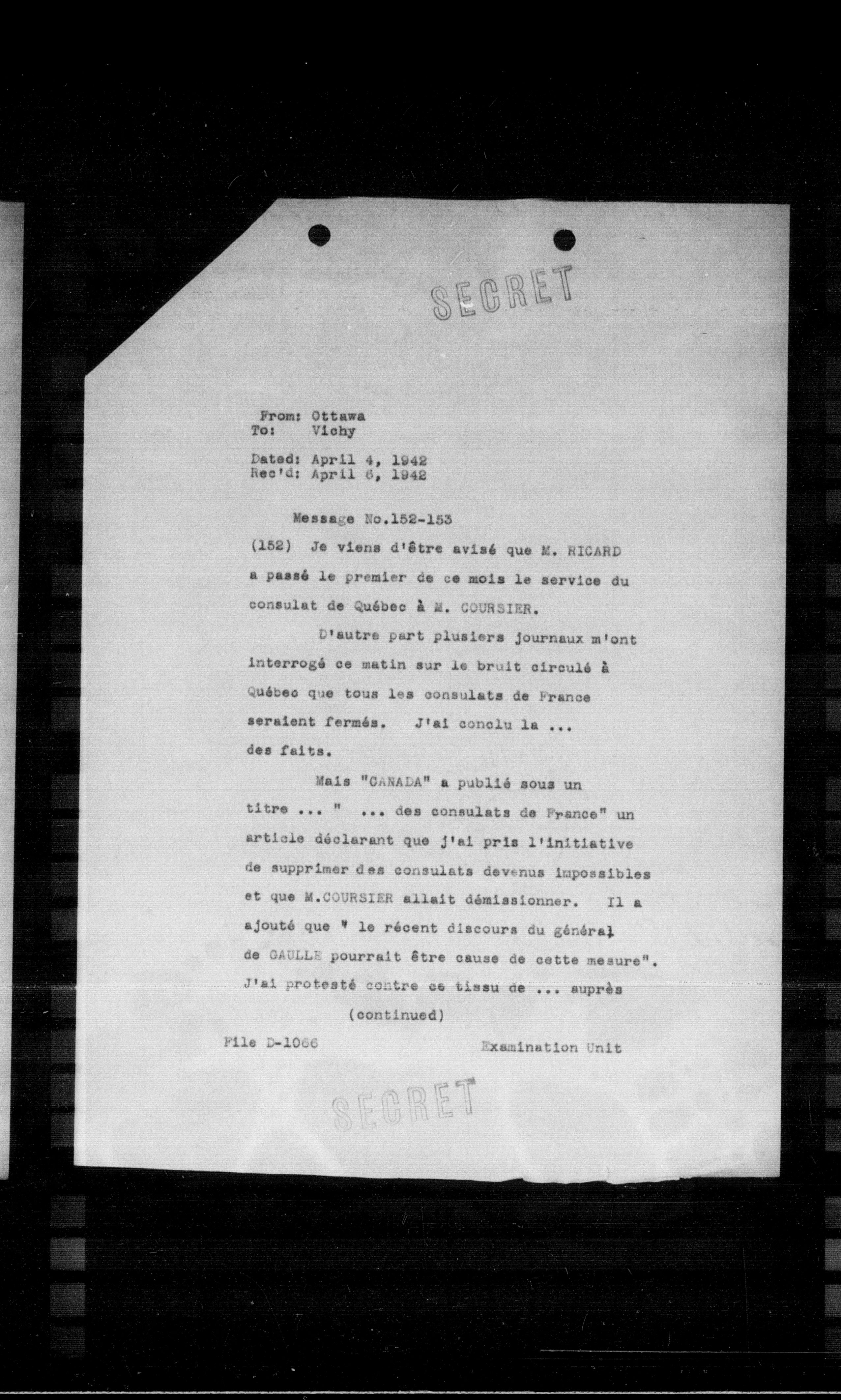 (152) Je viens d'être avisé que M. HICARD a passé le premier de ce mois le service du consulat de Québec à M. COURSIER.