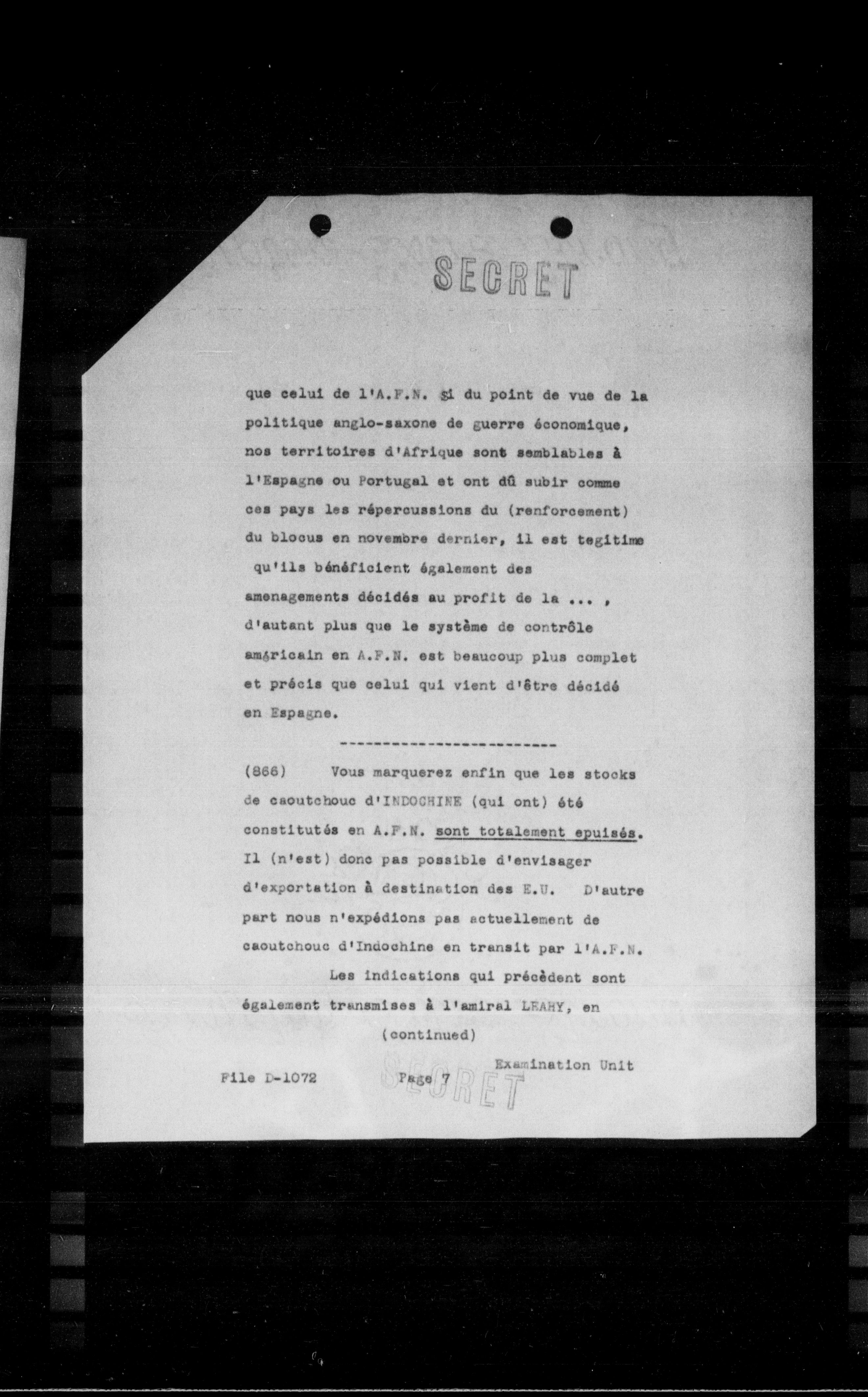 (866) Vous marquerez enfin que les stocks de caoutchouc d'INDOCHINE (qui ont) été constitutés en A.F.N. sont totalement épuisés. Il (n'est) donc pas possible d'envisager d'exportetion à destination des E.U. D'autre part nous n'expédions pas actuellement de caoutchouc d'Indochine en transit par l'A.F.N. Les indications qui précèdent sont également transmises à l'amiral LEARY, en (continued)