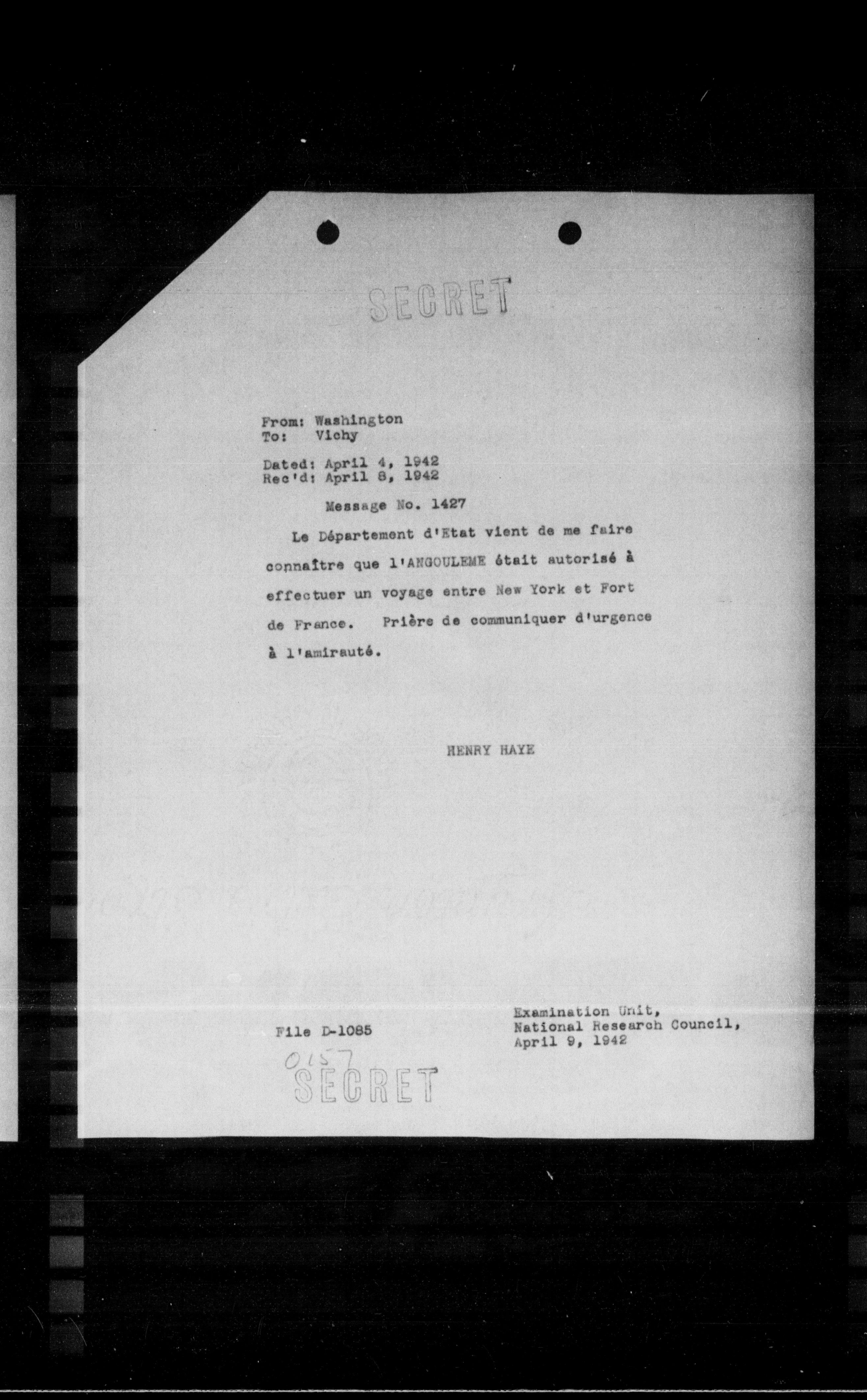 Le Département d'Etat vient de me faire connaître que l'ANGOULDME était autorisé à effectuer un voyage entre New York et Fort de France. Prise de communiquer d'urgence à l'amiraute.