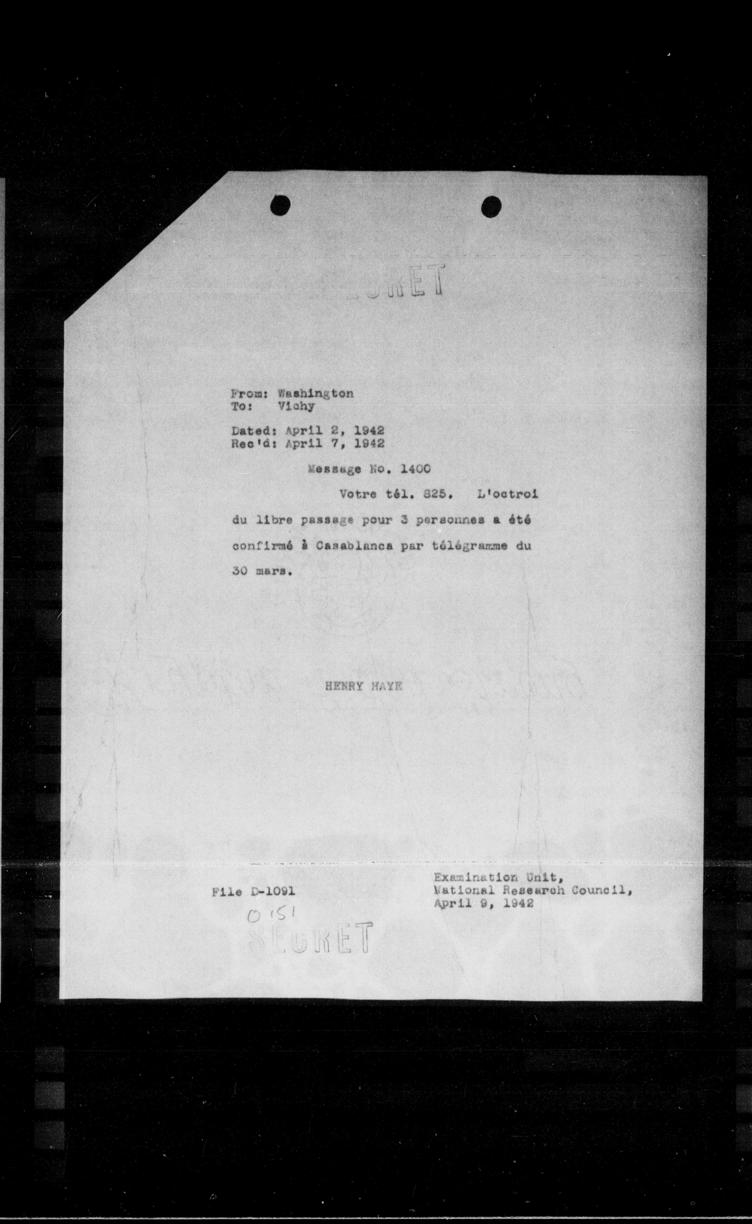 Votre tél. 325. L'octroi du libre passage pour 3 personnes a été confirmé à Casablanca par télégramme du 30 mars.