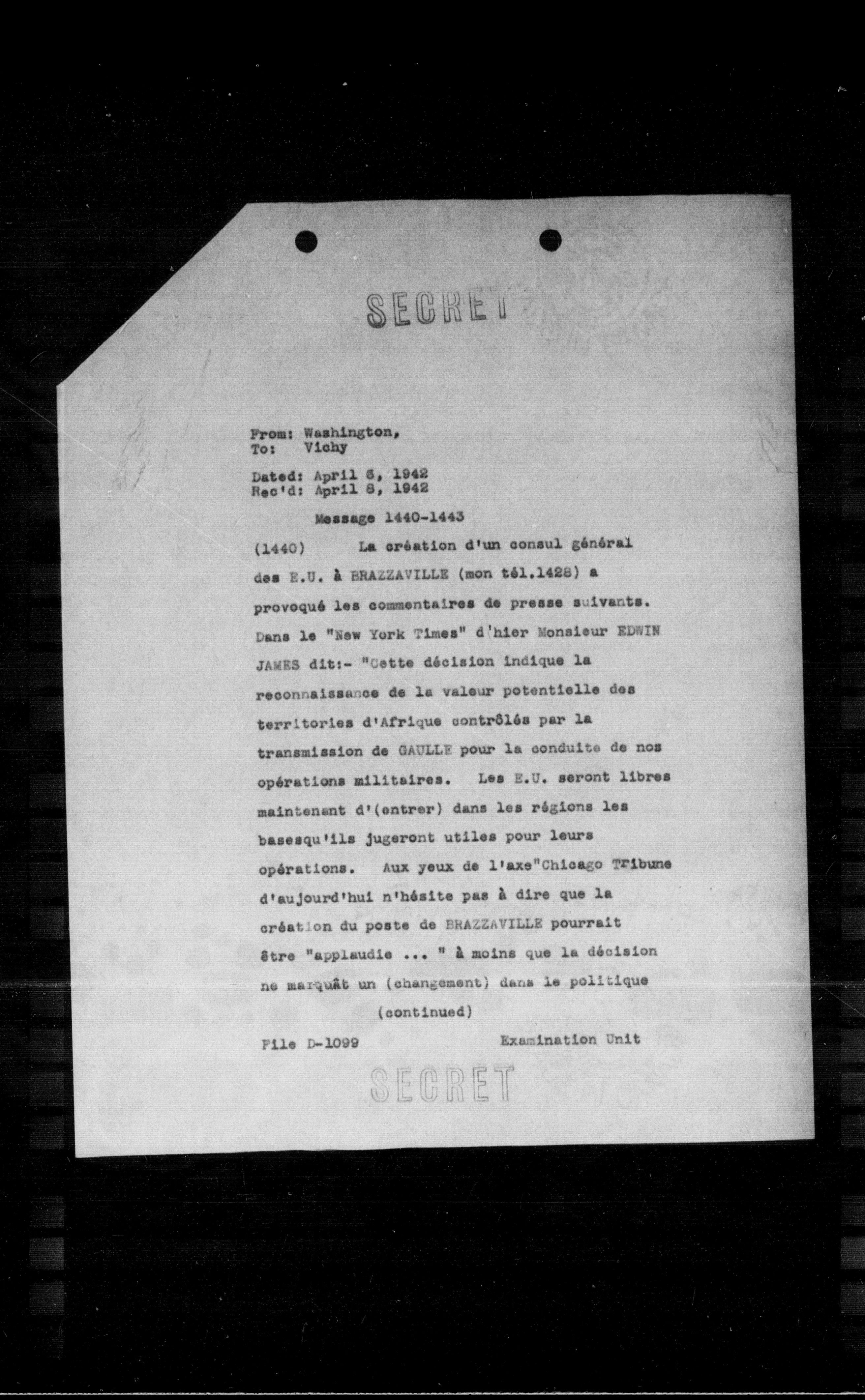 (1440) La création d'un consul général des E.U. a BRAZZAVILLE (mon tel.1428) a provoqué les commentaires de presse suivants. Dans le "New York Times" d'hier Monsieur EDWIN JAMES dit:- "Cette décision indique la reconnaissance de la valeur potentielle des territories d'Afrique contrôles par la transmission de GAULLE pour la conduite de nos opérations militaires. Les E.U. seront libres maintenant d'(entrer) dans les régions les basesqu'ils jugeront utiles pour leurs opérations. Aux yeux de l'axe"Chicago Tribune d'aujourd'hui n'hésite pas à dire que la création du poste de BRAZZAVILLE pourrait être "applaudie ... " à moins que la décision ne mazuât un (changement) dans le politique (continued)