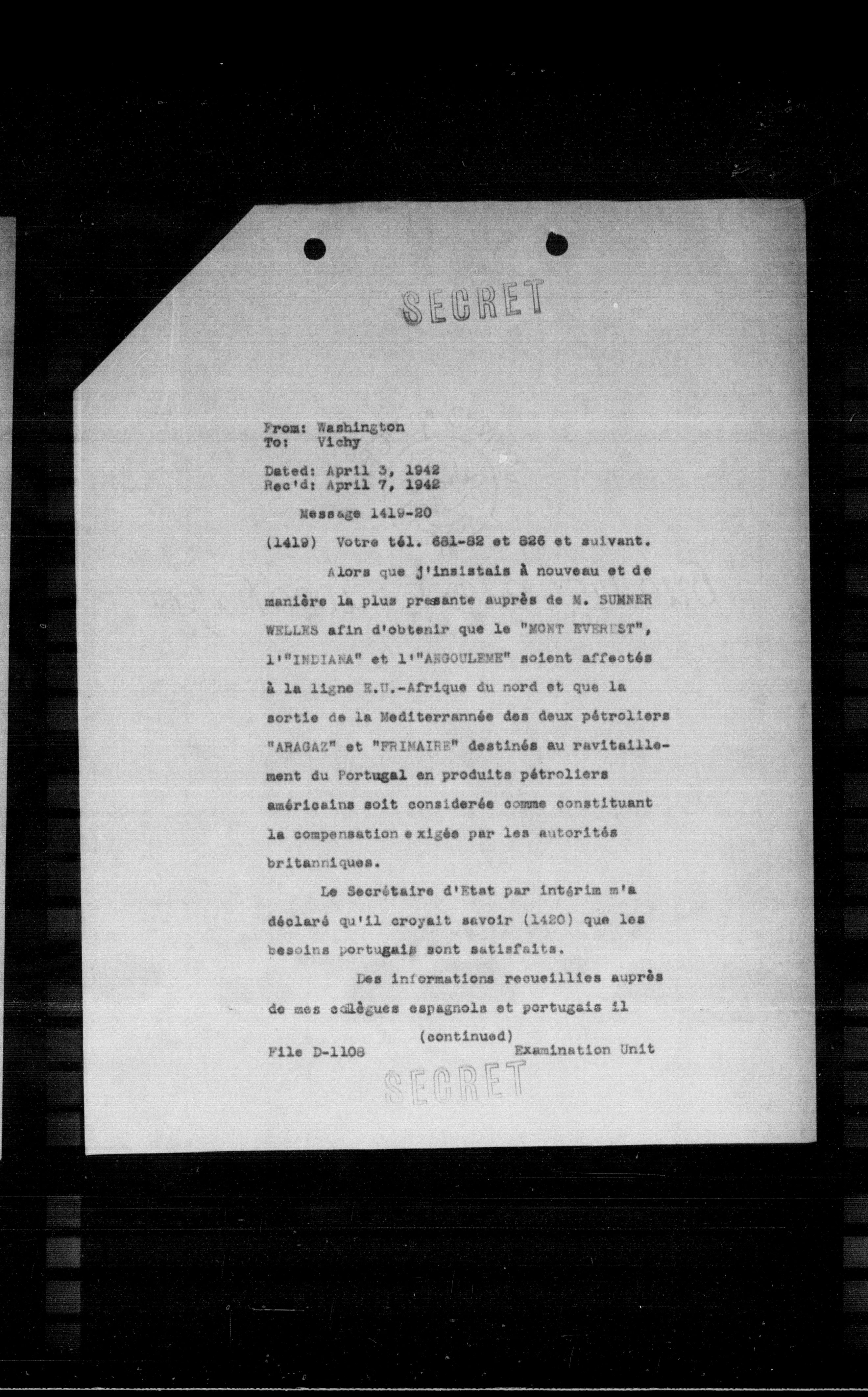 Alors que j'insistais à nouveau et de manière la plus presente auprès de N. SUMNER WELLES afin d'obtenir que le "NORT EYEREST", 11"INDIARA" et 11"ARGOULENE" soient affectés à la ligne E.U.-Afrique du nord et que la sortie de la Mediterrannée des deux pétroliers "ARAGAE" et "PRINAIRE" destinés au ravitaillement du Portugal en produits pétroliers américains soit considerée comme constituant la compensation exigée par les autorités britanniques.