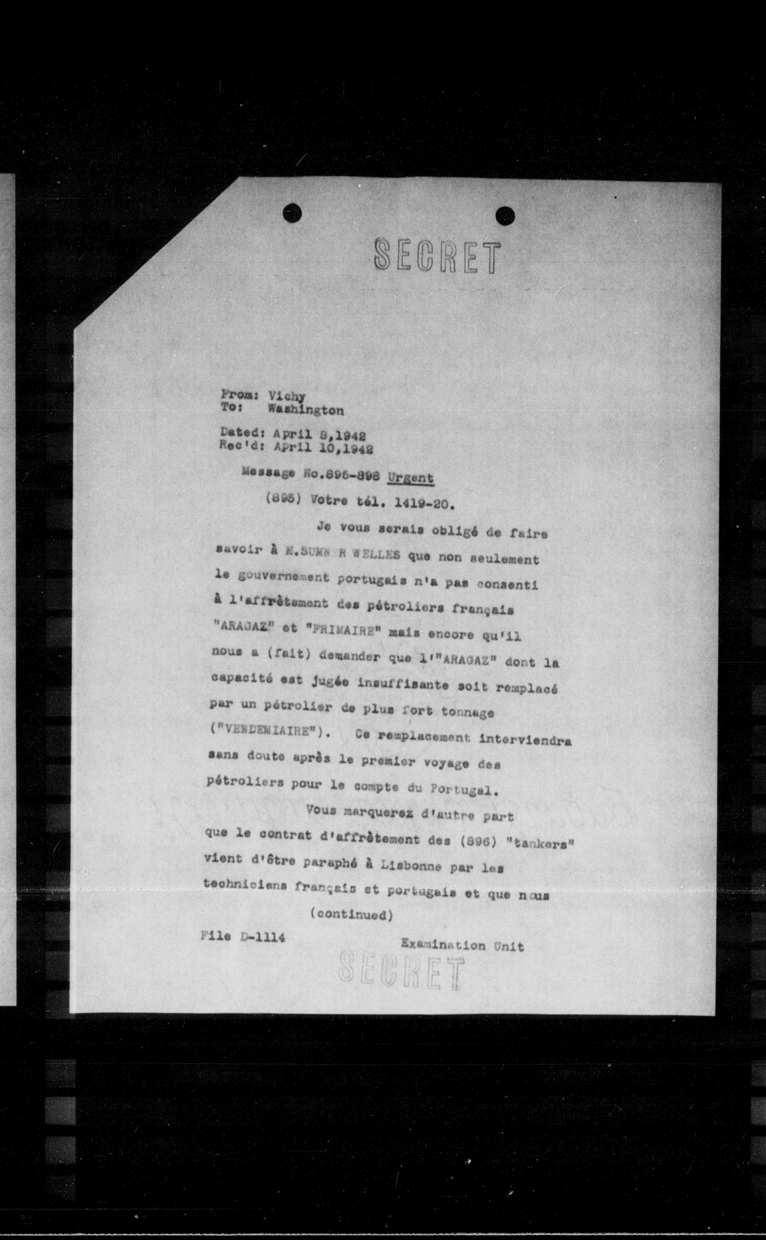 Je vous serais obligé de faire savoir à **M. SURS** et **WELLES** que non seulement le gouvernement portugais n'a pas consenti à l'affrètement des pétroliers français **"ARAGAZ"** et **"PRIMAIRE"** mais encore qu'il nous a (fait) demander que l **"ARAGAZ"** dont la capacité est jugée insuffisante soit remplacée par un pétrolier de plus fort tonnage **("VERDEMIAINE")**. Ce remplacement interviendra sans doute après le premier voyage des pétroliers pour le compte du Portugal.