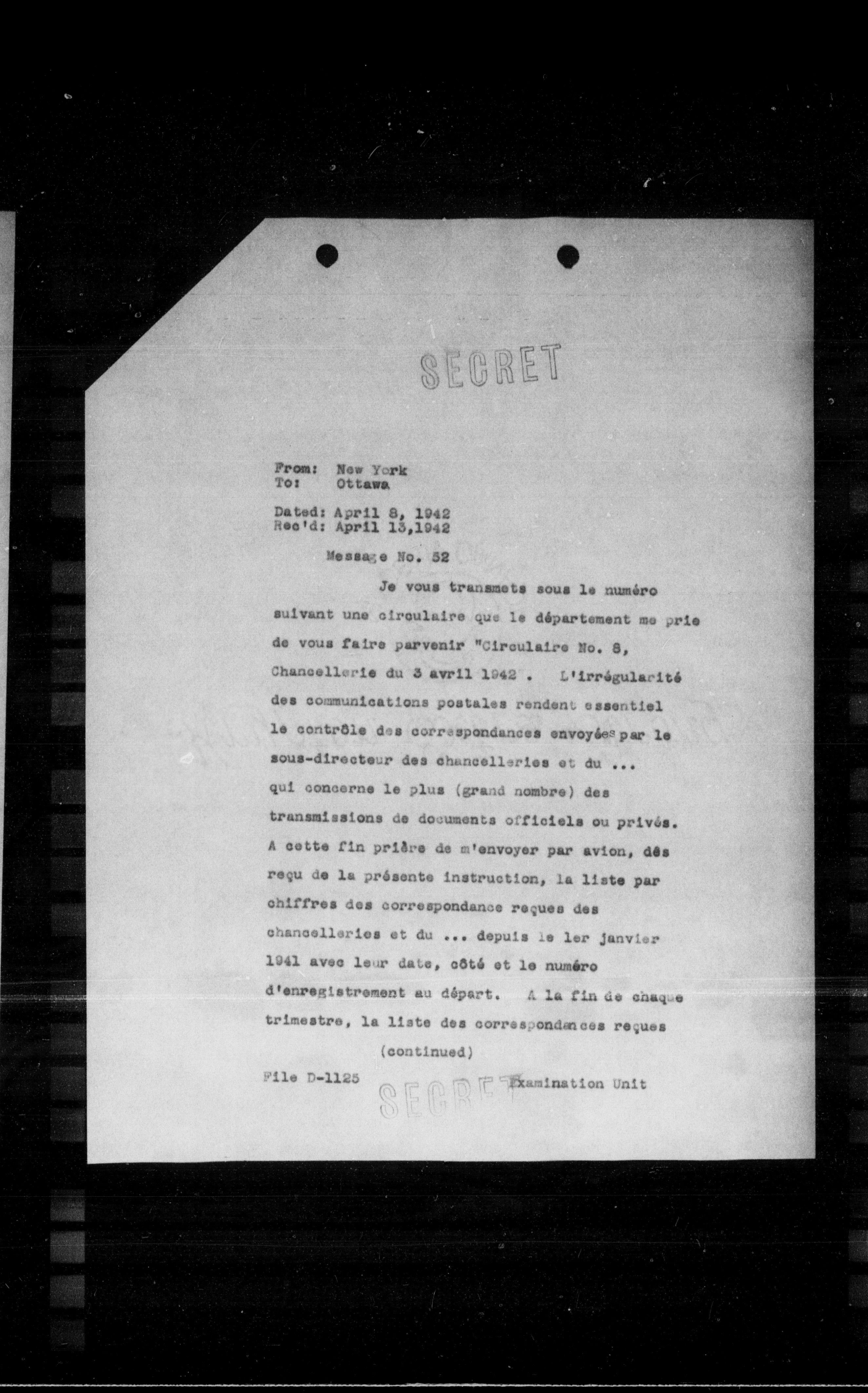 Je vous transmets sous le numéro suivant une circulaire que le département me prie de vous faire parvenir "Circulaire No. 8, Chancellerie du 3 avril 1942. L'irrégularité des communications postales rendue essentiel le contrôle des correspondances envoyées par le sous-directeur des chancelleries et du ... qui concerne le plus (grand nombre) des transmissions de documents officiels ou privés. À cette fin prière de m'envoyer par avion, dès reçu de la présente instruction, la liste par chiffres des correspondances reçues des chancelleries et du ... depuis le 1er janvier 1941 avec leur date, côté et le numéro d'enregistrement au départ. À la fin de chaque trimestre, la liste des correspondances reçues (continued)