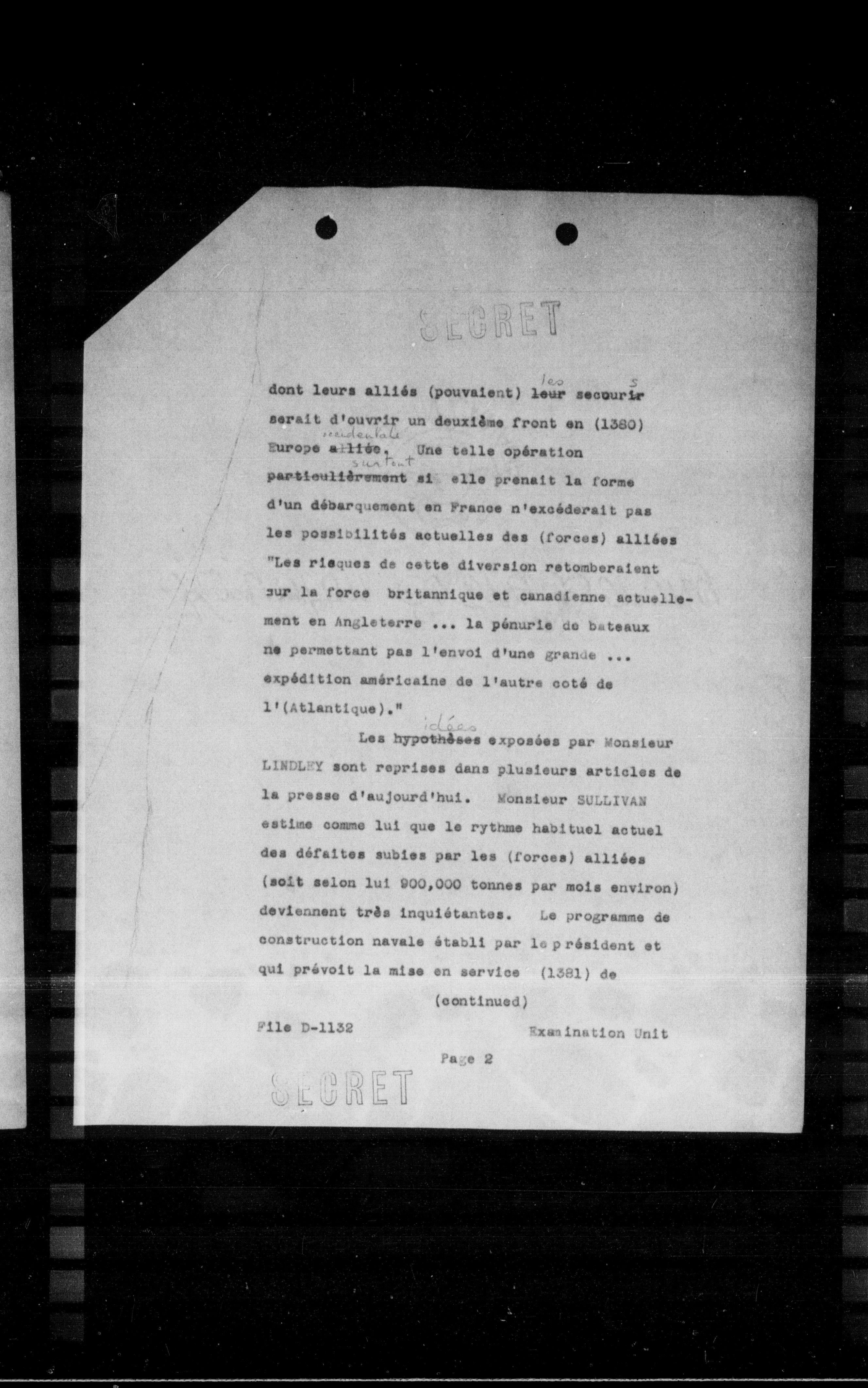 Les hypothèses exposées par Monsieur LINDLEY sont reprises dans plusieurs articles de la presse d'aujourd'hui. Monsieur SULLIVAN estime comme lui que le rythme habituel actuel des défaites subies par les (forces) alliées (soit selon lui 900,000 tonnes par mois environ) deviennent très inquiétantes. Le programme de construction navale établi par le président et qui prévoit la mise en service (1381) de (continued)