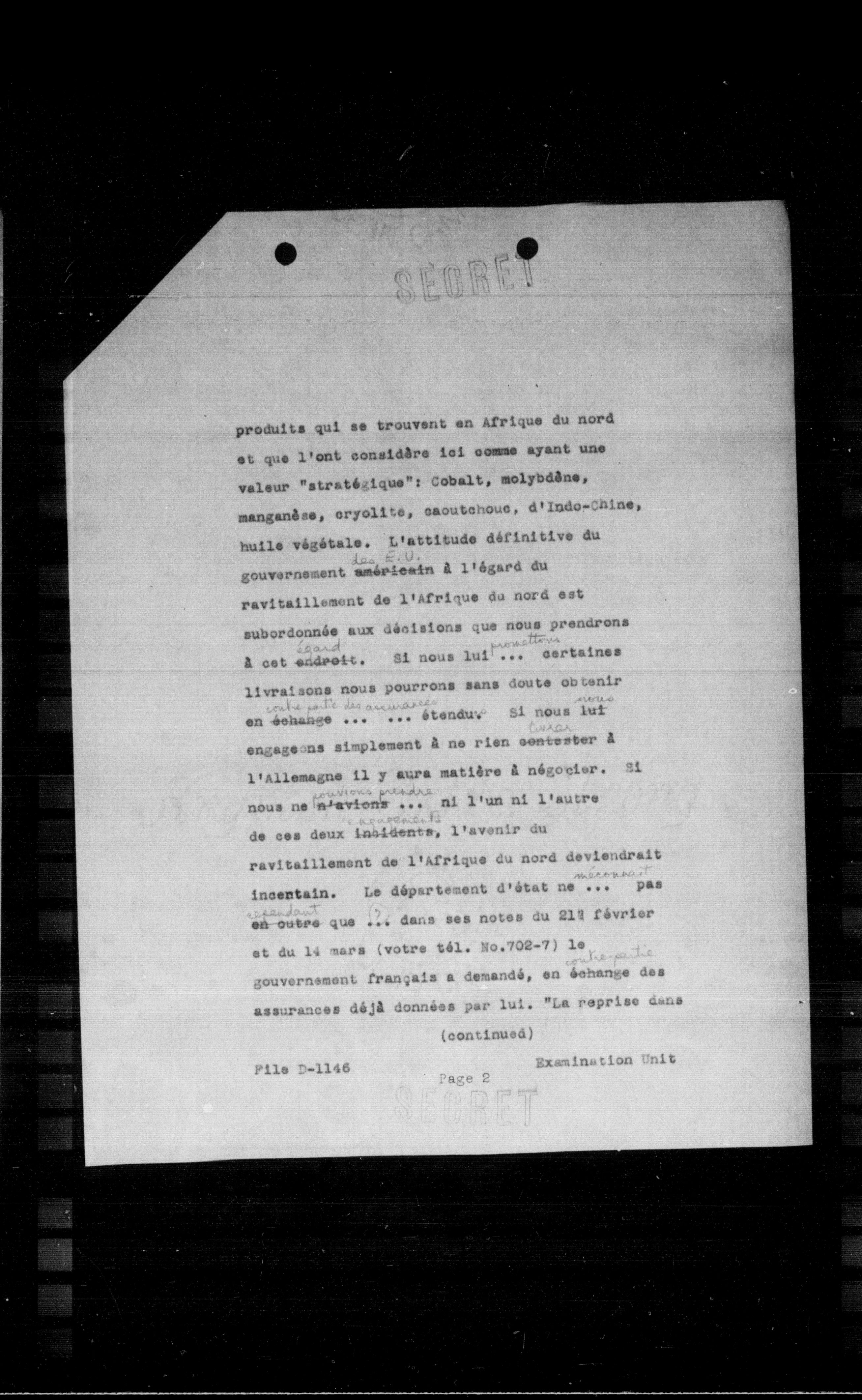 - produits qui se trouvent en Afrique du nord et que l'ont considéré tel comme ayant une valeur "stratégique": Cobalt, molybdène, manganèse, cryolite, caoutchouc, d'Indo-Chine, huile végétale. L'attitude définitive du gouvernement américain à l'égard du ravitaillement de l'Afrique du nord est subordonnée aux décisions que nous prendrons à cet endroit. Si nous lui... certaines livraisons nous pourrons sans doute obtenir en échange ... ... étendu. Si nous lui engageons simplement à ne rien contester à l'Allemagne il y aura matière à négocier. Si nous ne n'avions ... ni l'un ni l'autre de ces deux incidents, l'avenir du ravitaillement de l'Afrique du nord deviendrait incertain. Le département d'état ne ... pas en outre que ... dans ses notes du 219 février et du 14 mars (votre tél. No.702-7) le gouvernement français a demandé, en échange des assurances déjà données par lui. "La reprise dans (continued)