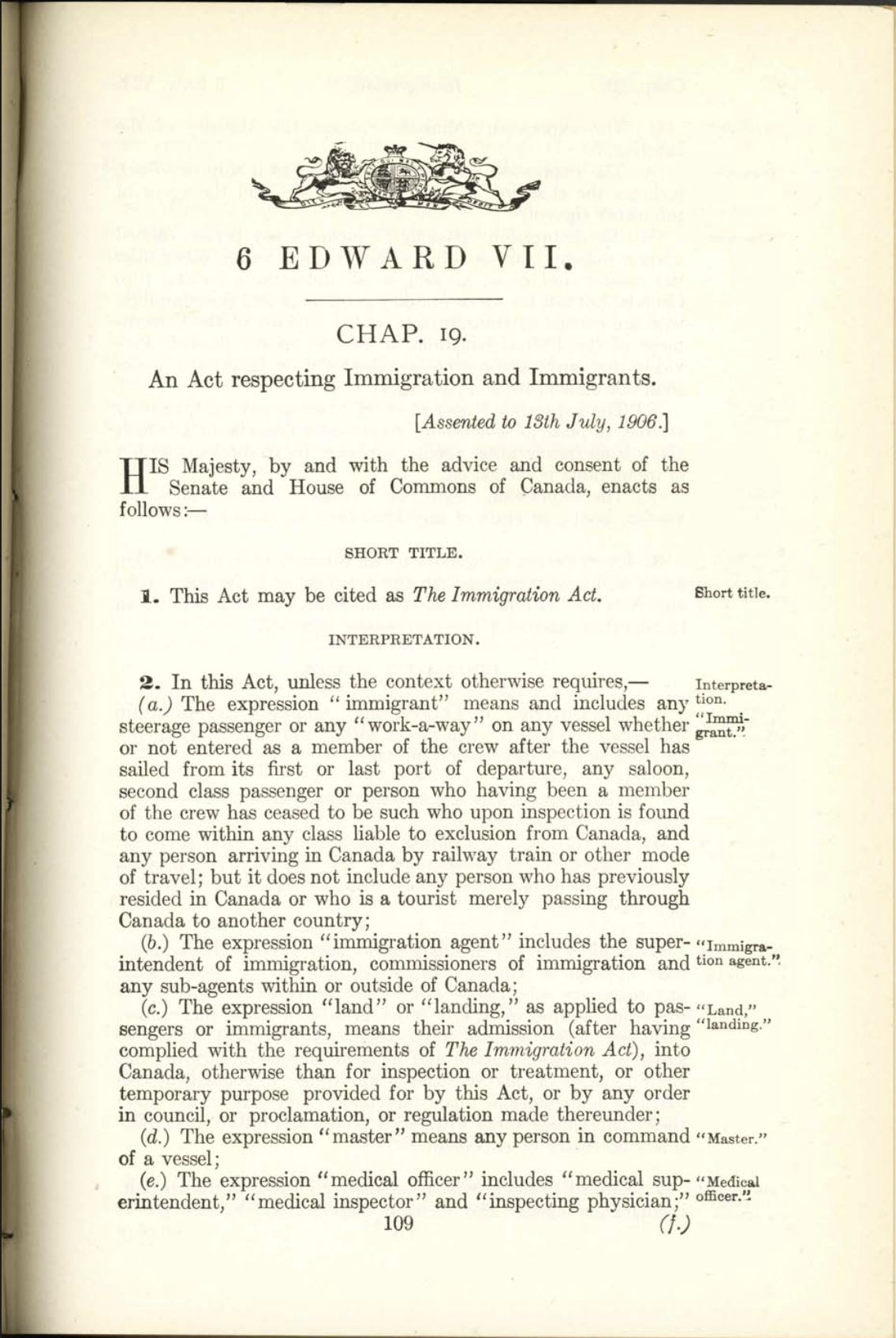 Canadian Museum of Immigration at Pier 21. Immigration Act, 1906. 1906. Library and Archives Canada. https://pier21.ca/research/immigration-history/immigration-act-1906.