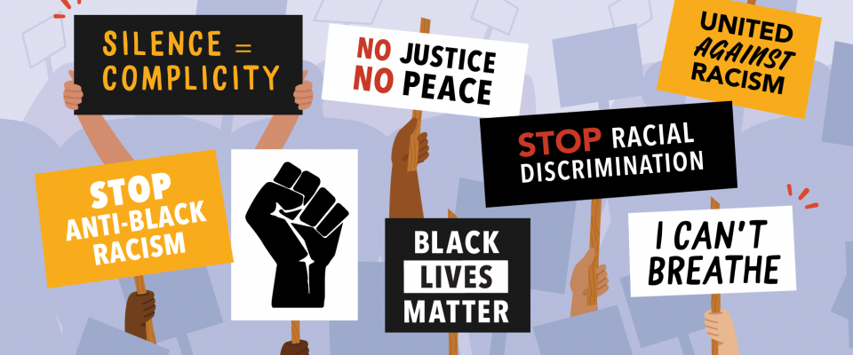 An animated image of people of different skin colours holding different kinds of signs, all protesting against anti-black racism.