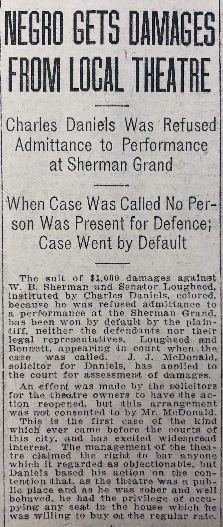 A newspaper clipping about Charles Daniels, an African-Canadian man. It details the case and outcome when he was refused admittance to a local theatre.