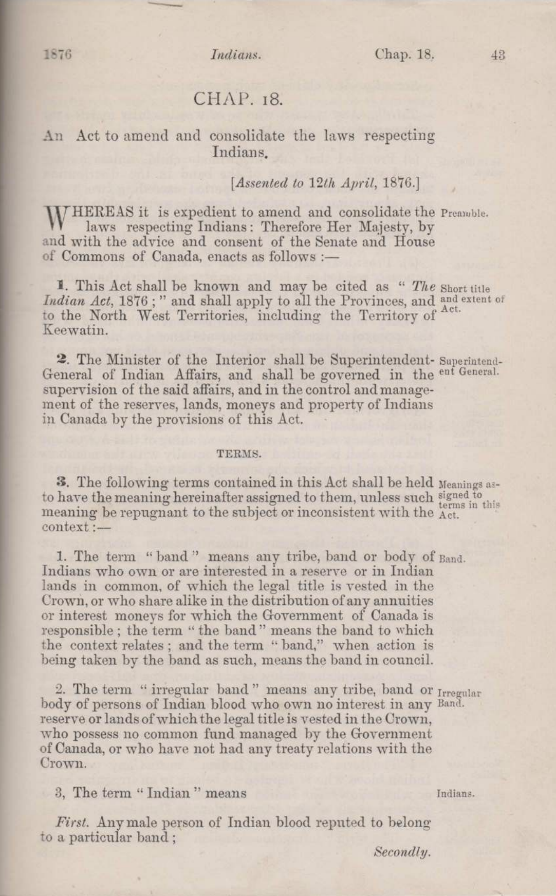 Legal Aid Saskatchewan. Indian Act (1876). April 12, 1867. The Indian Act. https://gladue.usask.ca/indianact.