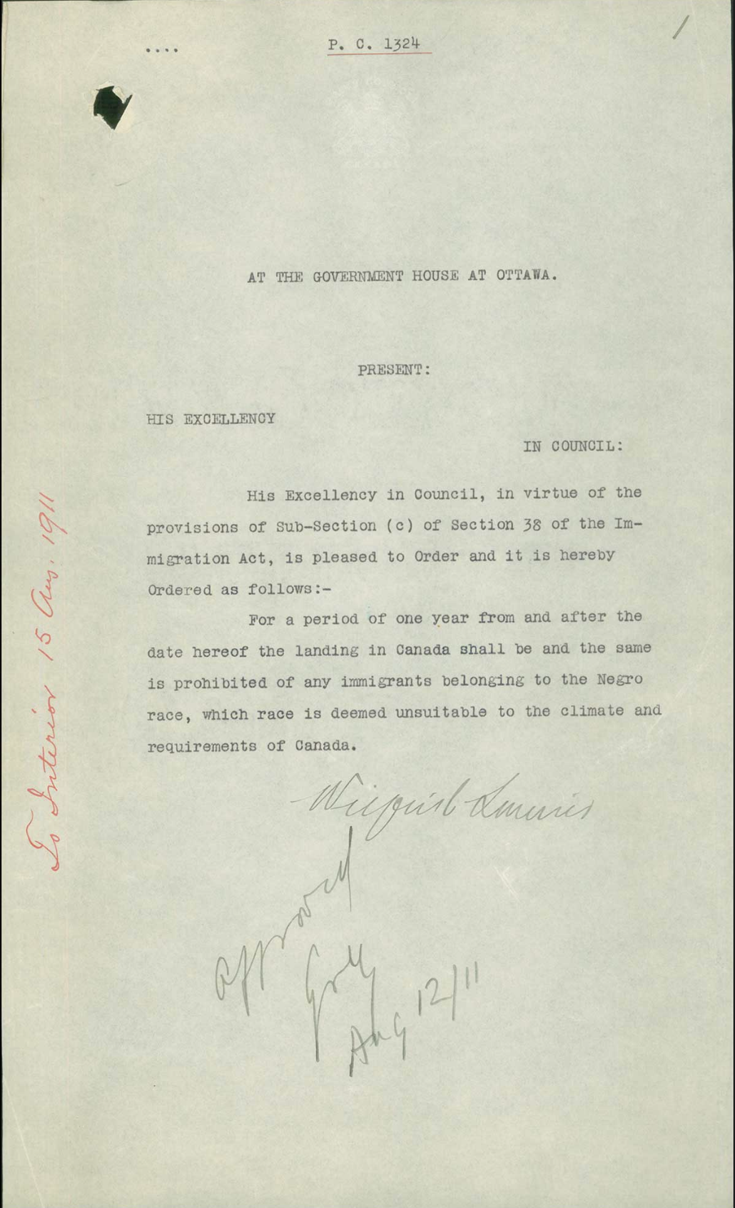 Government of Canada, “Order-In-Council 1911,” Black Canadian History Exhibit, accessed December 5, 2025, http://omeka.uottawa.ca/mathieu-black-canadian-history-exhibit/items/show/241.