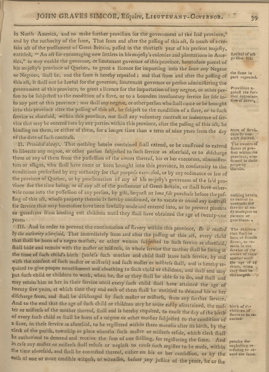Lieutenant Governor John Graves Simcoe & Province of Upper Canada, “An Act to Prevent the Further Introduction of Slaves, and to Limit the Term of Contracts for Servitude within this Province,” Black Canadian History Exhibit, accessed December 5, 2025, http://omeka.uottawa.ca/mathieu-black-canadian-history-exhibit/items/show/438.