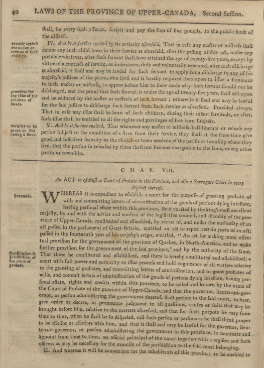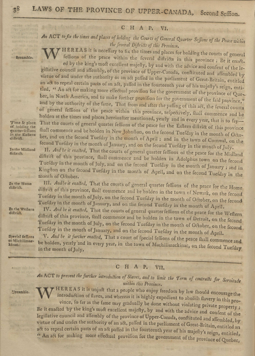 “An Act to Prevent the Further Introduction of Slaves, and to Limit the Term of Contracts for Servitude within this Province.” Upper Canada Statutes, 1793. British North American Legislative Database (BNALD), University of New Brunswick. https://bnald.lib.unb.ca/legislation/act-prevent-further-introduction-slaves-and-limit-term-contracts-servitude-within