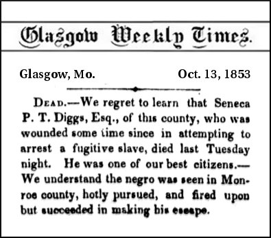 A column from the Glasgow Weekly Times dating back to October 13, 1853, announcing the death of Seneca Diggs.