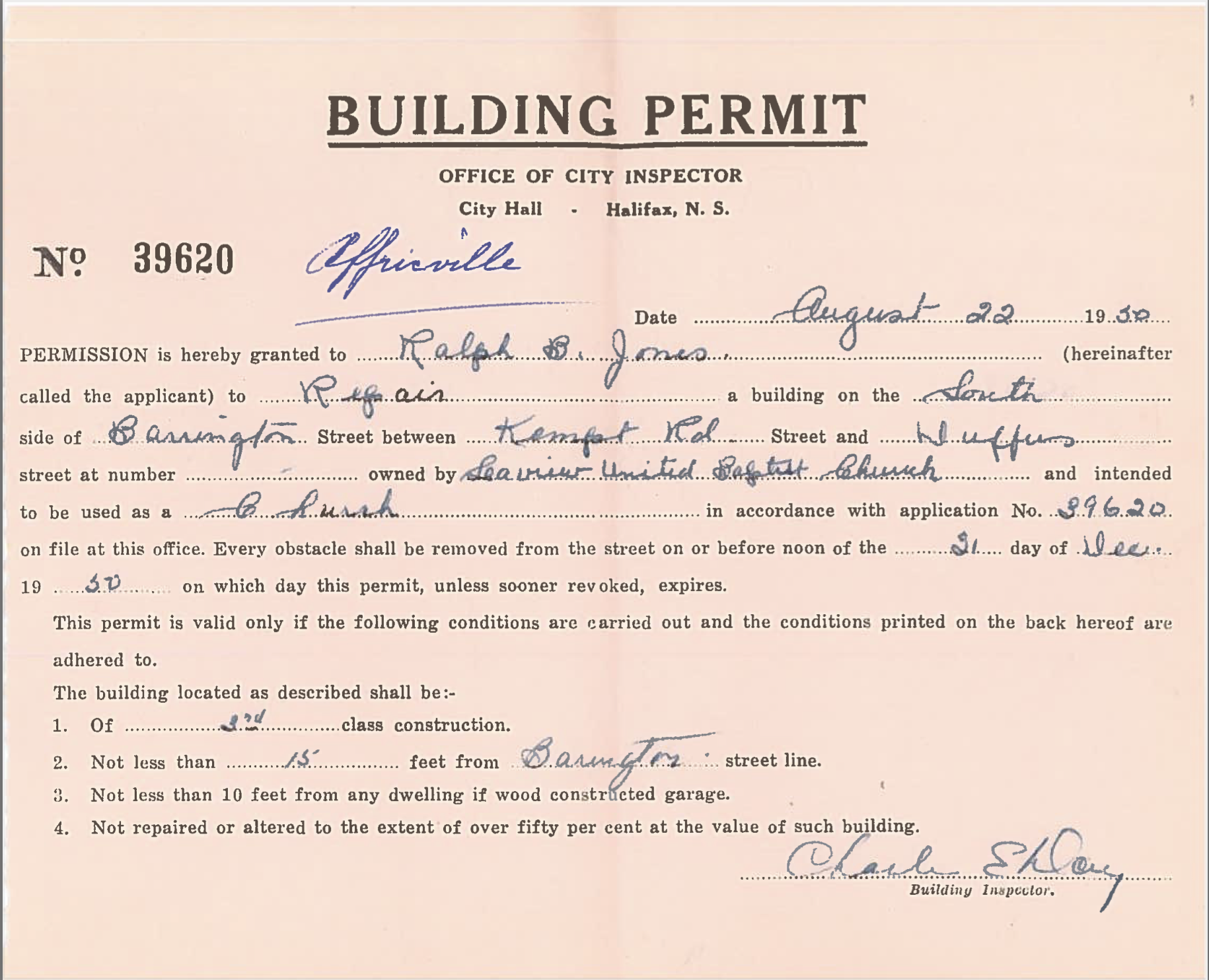 This repair permit for the Seaview United Baptist Church highlights both the church’s significance in Africville and Deacon Ralph Jones’s commitment as an individual community leader. The permit shows that residents actively worked to maintain and improve their central gathering space, countering claims made by Halifax city government that Africville’s buildings were neglected or poorly cared for. As a key figure in the church, Jones’s involvement in securing repairs reflects his dedication to preserving a place that served as the heart of spiritual and social life, as well as political organizing. This document demonstrates his sense of responsibility, showing him as a proactive caretaker who helped to sustain the community’s stability and collective identity.