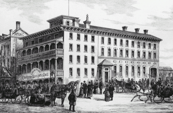 Canadian Academy of Arts Building, 1880. Illustration (wood-engraving). Canadian Illustrated News, March 20, 1880. Wikimedia Commons.