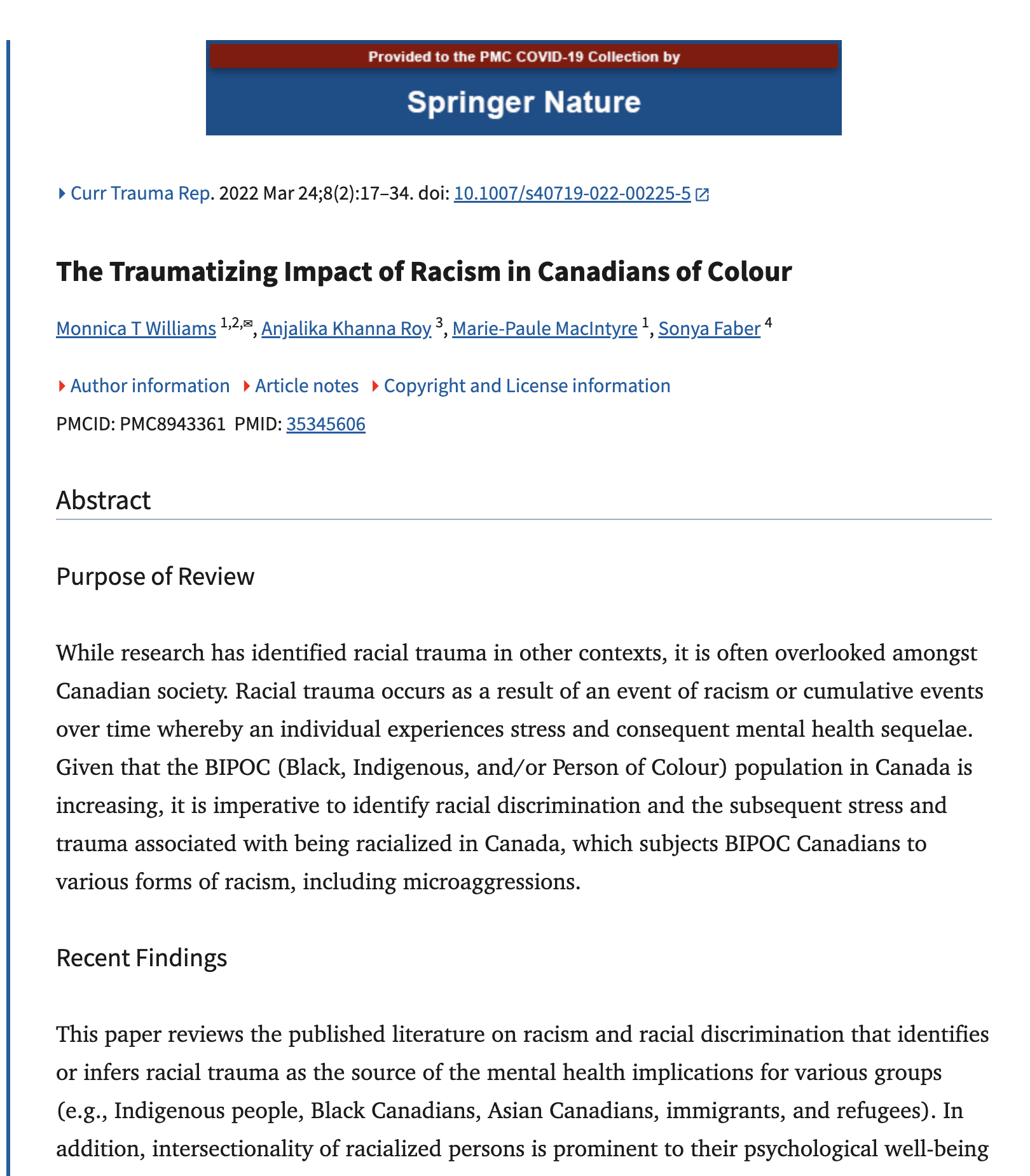 Williams, Monnica T., Anjalika Khanna Roy, Marie-Paule MacIntyre, and Sonya Faber. “The Traumatizing Impact of Racism in Canadians of Colour.” Current Trauma Reports 8, no. 2 (March 24, 2022): 17–34. https://doi.org/10.1007/s40719-022-00225-5.