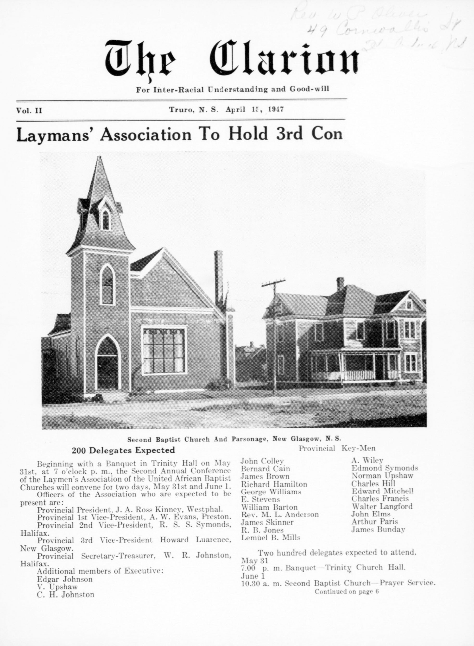 “The Clarion. “Laymen’s Association to Hold 3rd Con.” The Clarion - for Inter-Racial Understanding and Good-Will 2, no. 7 (April 15, 1917): 1.,” Black Canadian History Exhibit, accessed December 5, 2025, http://omeka.uottawa.ca/mathieu-black-canadian-history-exhibit/items/show/617.