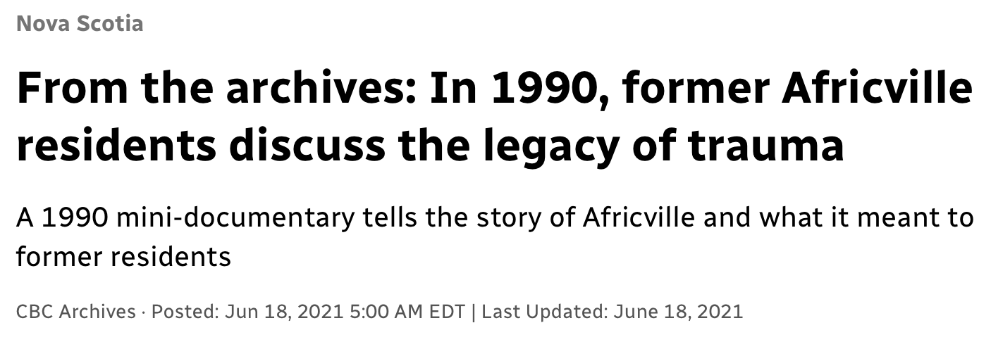 "From The Archives: In 1990, Former Africville Residents Discuss The Legacy Of Trauma," In CBC News, 18 June 2021.