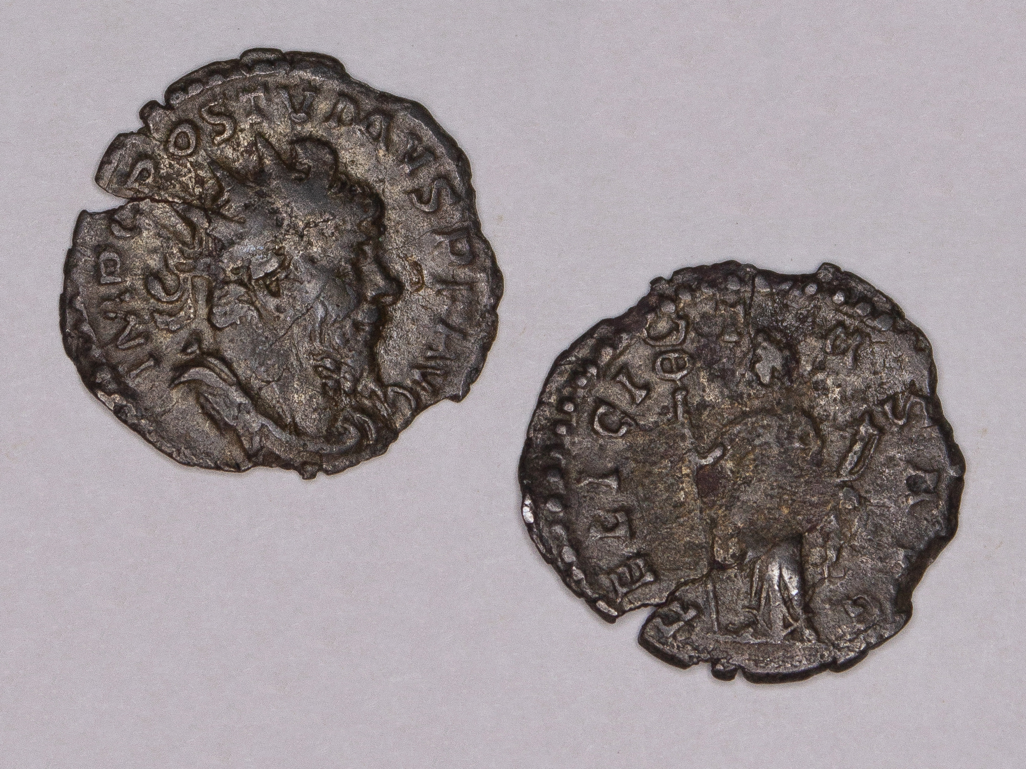 Obverse legend: IMP(erator) C(aesar) POSTVMVS P(ius) F(elix) AVG(ustus), translation: Emperor Caesar Postumus Dutiful Fortunate Augustus; radiate, cuirassed, and draped bust of Postumus facing right. Reverse legend: FELICI-T-AS AVG(usta), translation: The good fortune of the emperor; Felicitas, draped, standing left, holding caduceus in right hand and cornucopia in left hand. RIC V.II, p. 342, no. 58.
